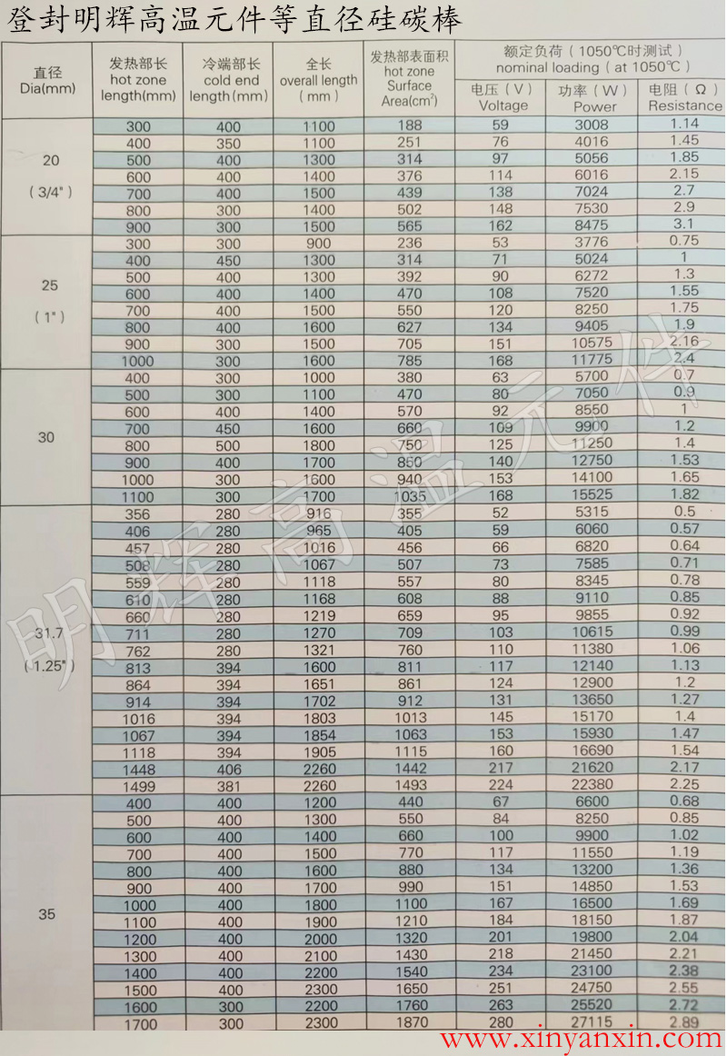 登封市明輝高溫元件有限公司硅碳棒生產(chǎn)廠家,來圖定制,電阻一致,品質(zhì)售后,歡迎來電。常用規(guī)格硅碳棒額定功率電壓電流表如下,表格僅供參考,因爐子功率及裝棒支數(shù)、接線方式,使用爐溫等因素,棒的阻值可根據(jù)實際情況來定。